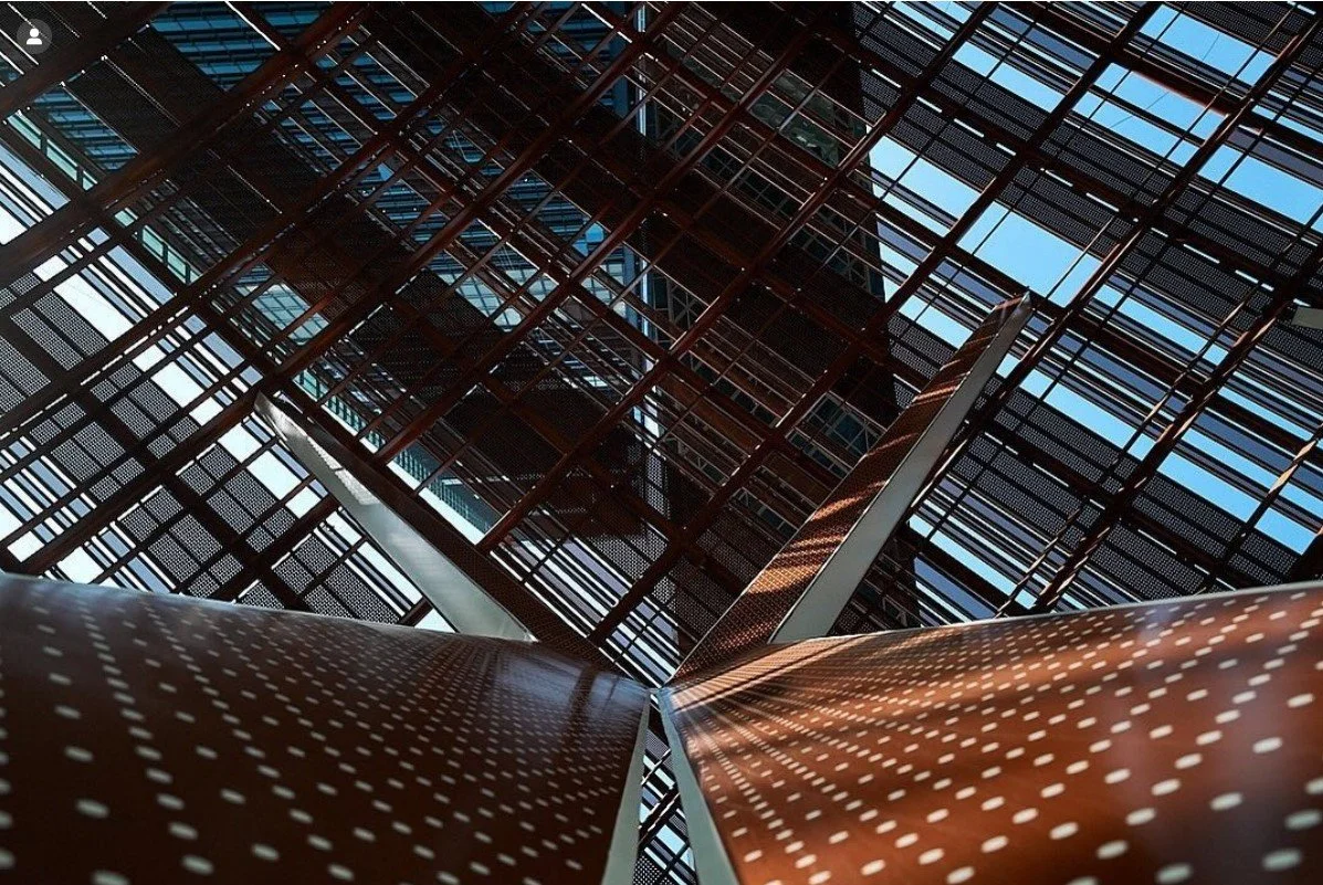 Above the primary grid lies a perforated aluminium cladding system, distributed parametrically in three tones to optimise lighting and projection. Below, the canopy is finished with irregularly spaced Iroko timber fins, offering texture and warmth at the pedestrian scale.