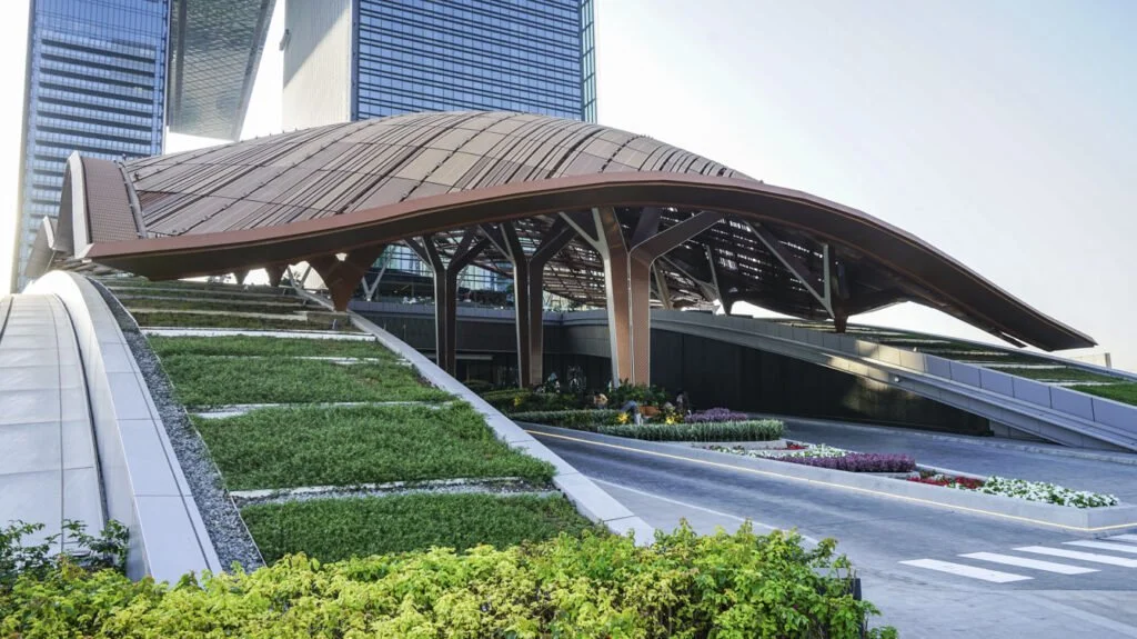 The canopy is a dramatic intervention that spans over the drop-off area, bridging the landscaped gardens and the high-rise towers. Its gently undulating form and layered design create a dynamic architectural statement, responding to the surrounding site while also offering a platform for projection and performance.