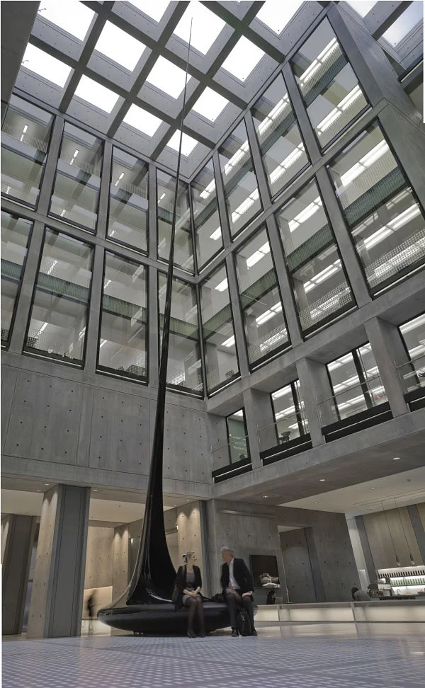 Out of the Strong Came Forth Sweetness is a stunning new sculpture by Ian McChesney for the Angel Building in London. The shape of the piece was generated by allowing treacle to fall from a spoon - the resulting form is then inverted. The unit comprises an oval seating area from which extends a narrow twenty two metre high spar - that’s over 5 double decker buses.